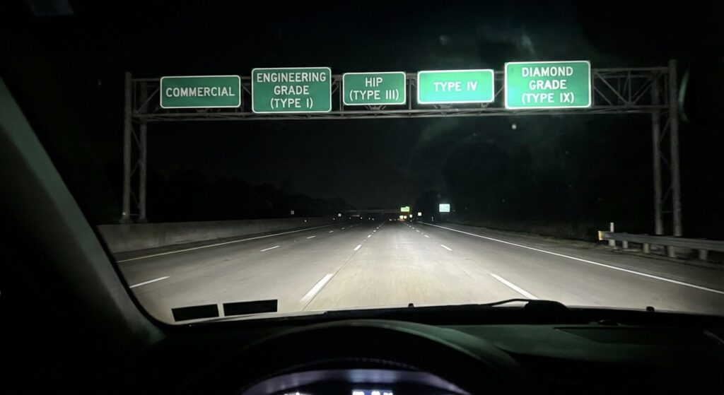 | 4 | High Intensity Prismatic (Type IV) | ASTM Type IV / มอก. แบบที่ 4 | Microprismatic | 250-400 เมตร | ถนนหลัก,ทางหลวงรอง |